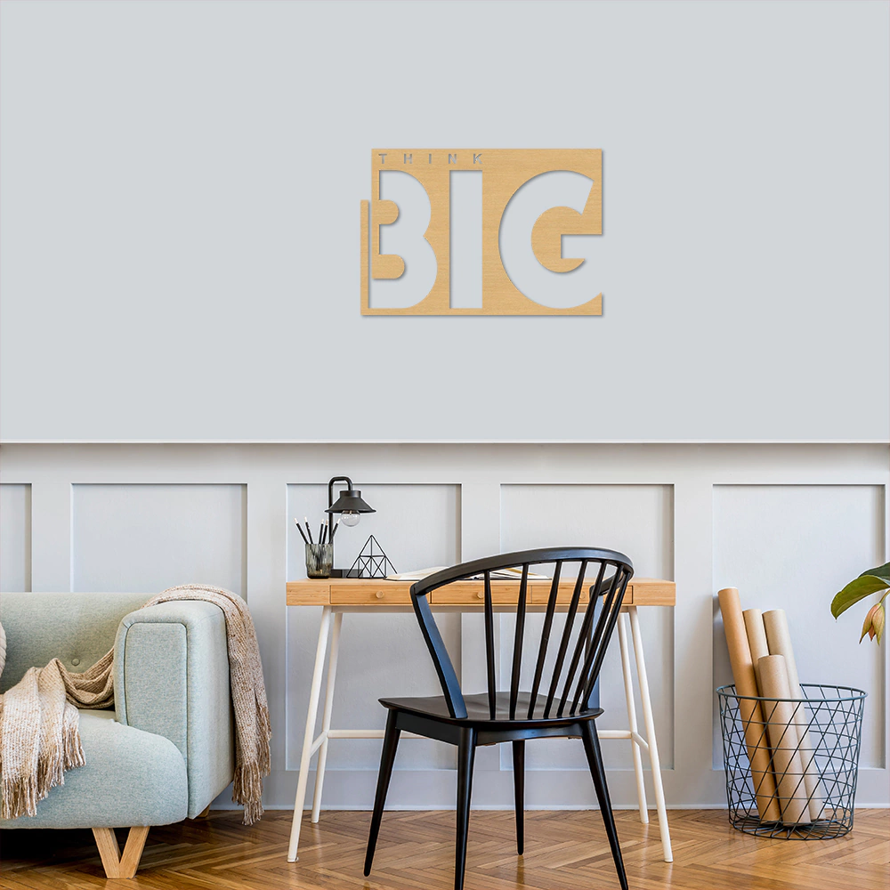 A Escultura de parede " Frase, Think Big " é produzida em MDF 6mm Revestidos com Laminação em Melamina Texturizada frente e verso da peça ( nao é pintura/tinta ). Esse tipo material gera maior proteção, durabilidade e elegância para o produto. As laterais trazem acabamento em Preto, harmonizando com todos os ambientes e cores. Nossas Esculturas de parede são perfeitas para decorar todo tipo de ambiente, sendo eles: Salas, Quartos, Escritórios e muitos outros. Garantimos satisfação, beleza e qualidade para seu ambiente.